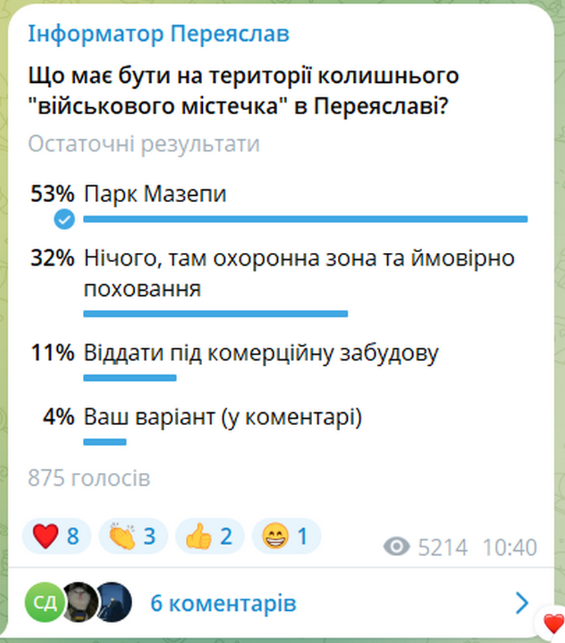 Зрозуміло, що ця тема лише розвиватиметься. А поки ми запитали в своєму Telegram-каналі, що читачі хотіли би бачити на цій території. В опитуванні взяли участь 875 людей. Найбільше респондентів хочуть, щоби на місці колишнього “військового містечка” був парк Івана Мазепи – 53%. Майже третина (32%) вважає, що там нічого не потрібно робити, адже ця територія є охоронною зоною та, ймовірно, має поховання. 11% пропонують віддати територію під комерційну забудову.
