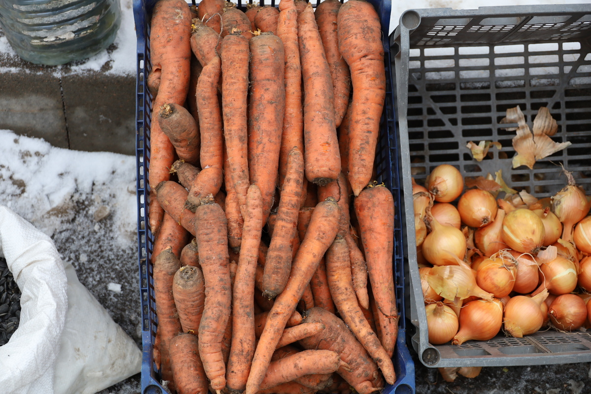 Овочів на прилавках побільшало. Продавці здебільшого торгували ними, накриваючи товар, аби захистити його від морозу. Цього разу на базарі було більше як картоплі, так і моркви – її продавали по 20 грн за кілограм. Також у продажу були буряк і цибуля, вартість яких становила 20 грн. Залишається великий вибір і квашених овочів. З’явились і нові фрукти. Ціни були такими: