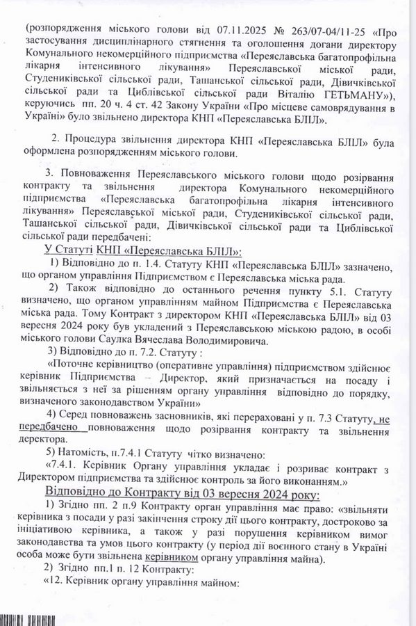Процедуру звільнення директора лікарні оформили за розпорядженням міського голови. У відповіді зазначили, що повноваження міського голови щодо розірвання контракту та звільнення керівника підприємства передбачені чинними установчими документами та умовами контракту. Зокрема, у Статуті КНП “Переяславська БЛІЛ” визначено, що органом управління підприємством є Переяславська міська рада. Відповідно до пункту 5.1, саме вона також здійснює управління майном підприємства. На цій підставі контракт із директором від 3 вересня 2024 року було укладено з Переяславською міською радою в особі міського голови Вячеслава Саулка.