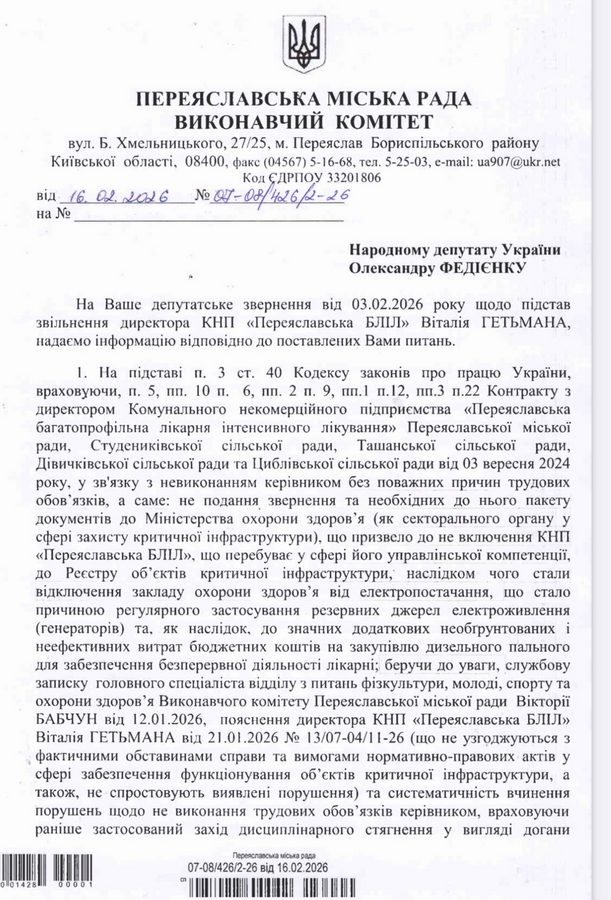 16 лютого Федієнко сповістив, що отримав відповідь від Вячеслава Саулка. У ній, зокрема, йдеться, що підставою для звільнення стало невиконання керівником без поважних причин трудових обов’язків – неподання звернення та необхідного пакета документів до Міністерства охорони здоров’я як секторального органу у сфері захисту критичної інфраструктури. Це призвело до того, що КНП “Переяславська БЛІЛ”, яке перебуває у сфері його управлінської компетенції, не було включене до Реєстру об’єктів критичної інфраструктури. Наслідком стало відключення закладу від електропостачання та регулярне використання резервних джерел живлення – генераторів.