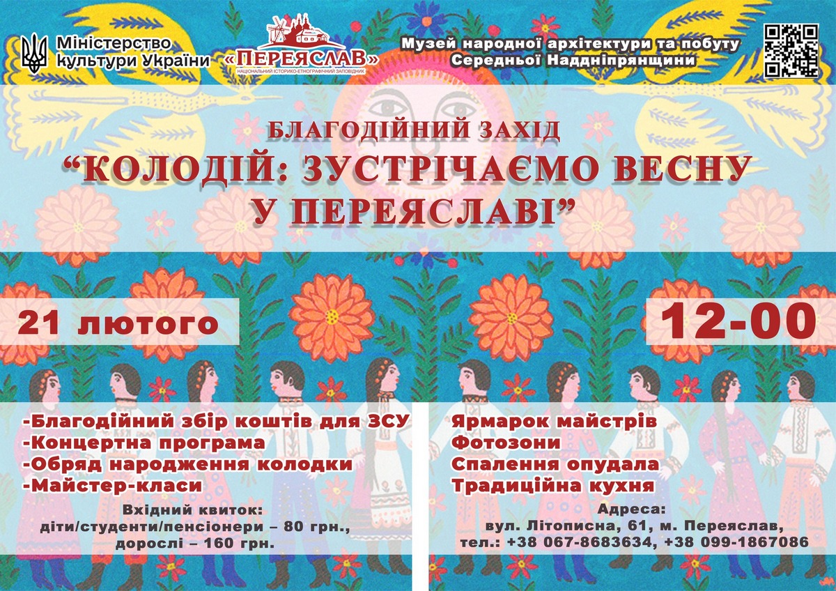 У суботу, 21 лютого, у музеї народної архітектури та побуту Середньої Наддніпрянщини проведуть благодійний захід на підтримку ЗСУ “Колодій: зустрічаємо весну в Переяславі”. Розпочнеться він о 12:00. Про це повідомили на Facebook-сторінці НІЕЗ “Переяслав”, передає Інформатор.