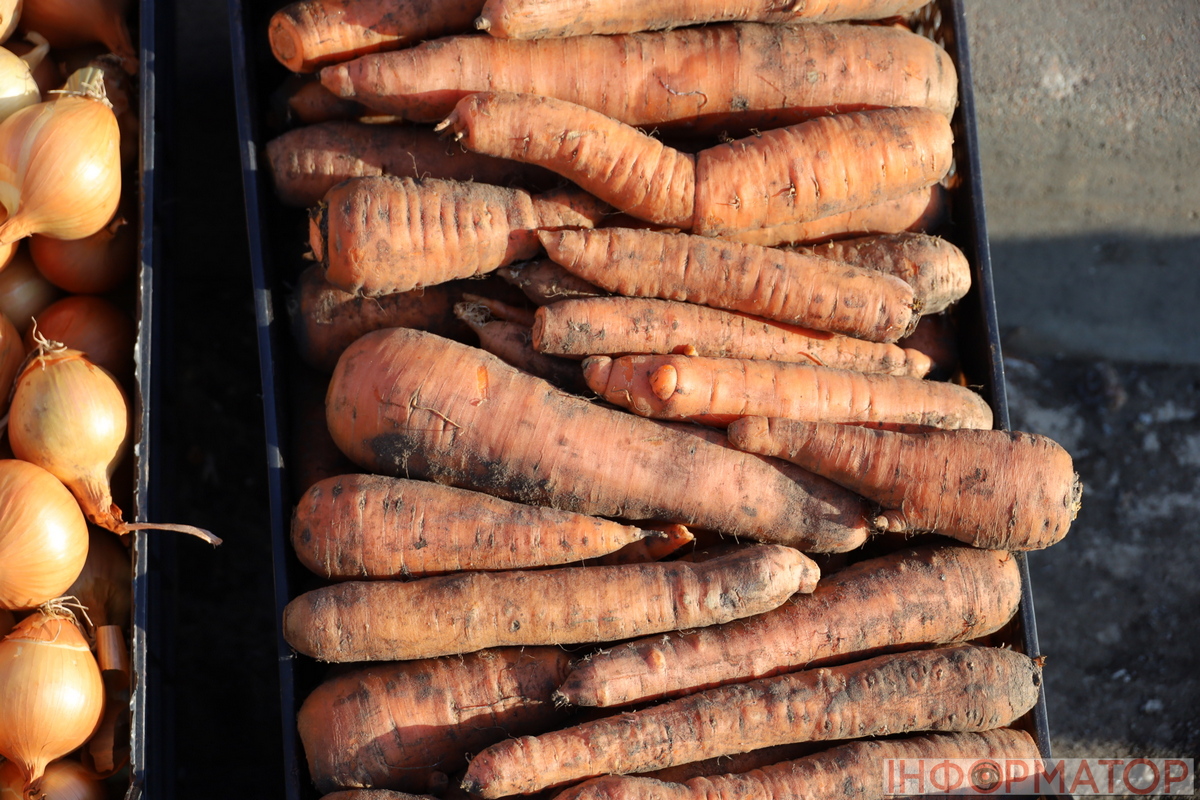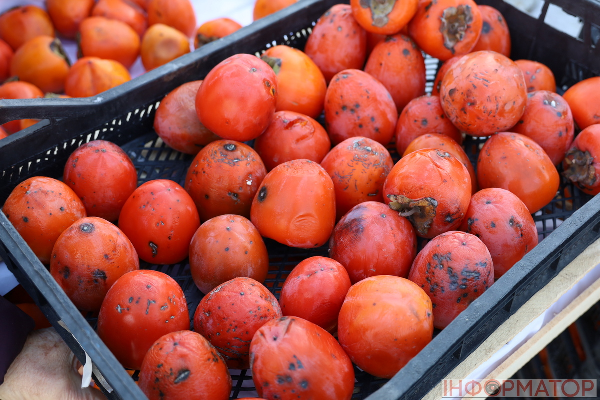 Найбільш помітні зміни в асортименті стосувалися саме фруктів та овочів. Із фруктів продавали банани, хурму, грейпфрути, лимони та залишки яблук, а з овочів – картоплю, цибулю, моркву, капусту й буряк. Продавчині розповіли, що покупці часто скаржаться на ціни, однак купувати в магазинах не поспішають: там продукція інколи дешевша, проте, за їхніми словами, поступається за смаком. Великий попит спостерігався й біля однієї з небагатьох точок із фруктами – тут вишикувалася черга, а продавці ледве встигали відпускати товар і підносити нові ящики. Ціни на овочі та фрукти були такими: