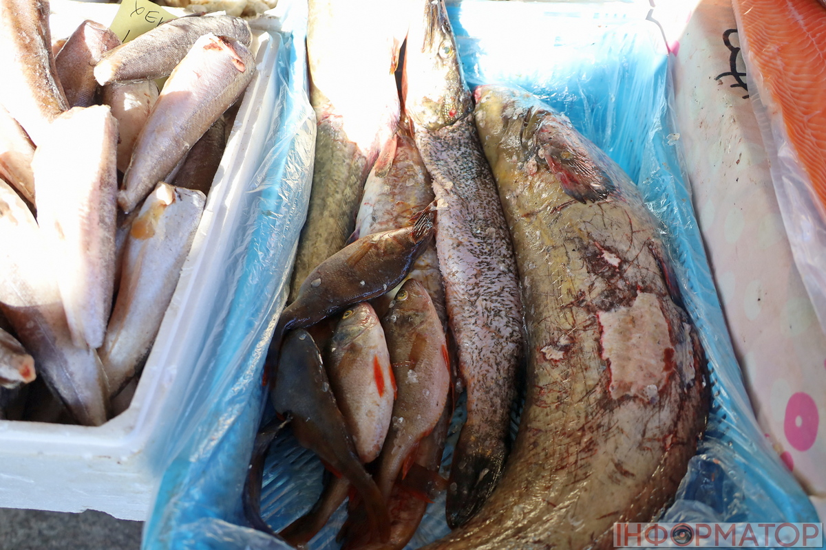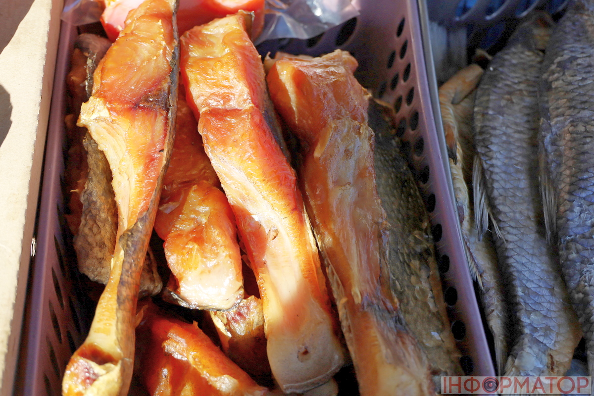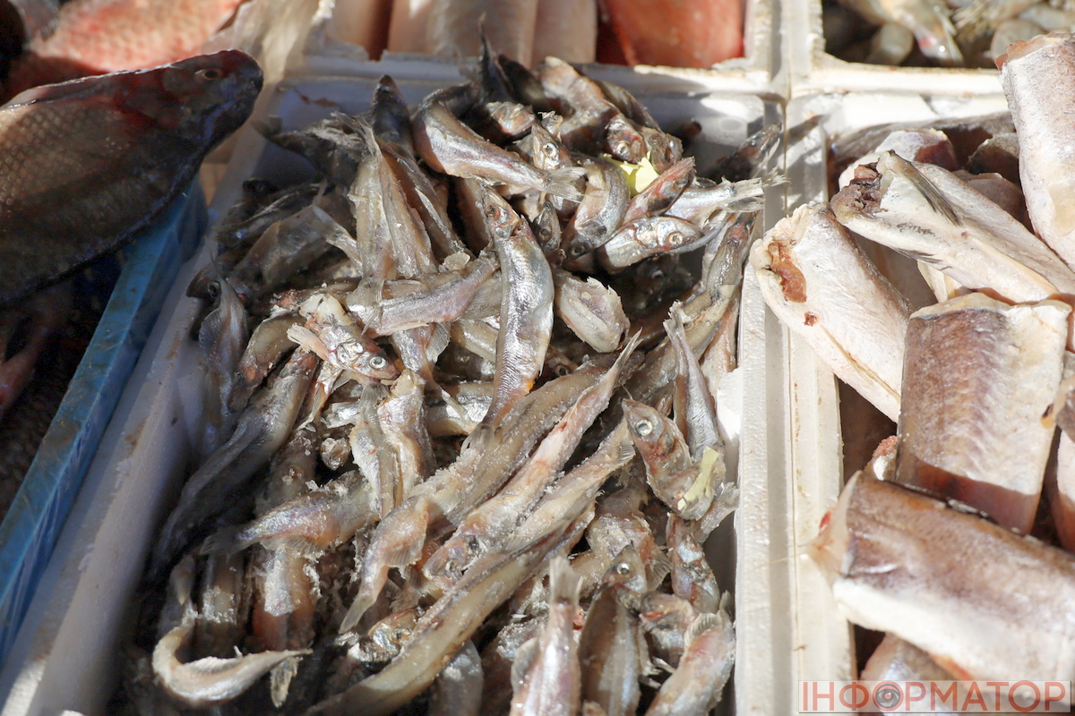 У рибному ряду продавчиня розповіла, що порівняно з минулим тижнем ціни не змінювалися. Дехто з покупців просив відрізати половину рибини, а інші ділилися кумедними історіями. Одна із відвідувачок, наприклад, розповіла, що напередодні купила тут рибу, але забула попросити її почистити, тож увесь вечір довелося самотужки з нею поратися. Загалом рибна продукція користується попитом серед покупців. Ціни на неї були такими: