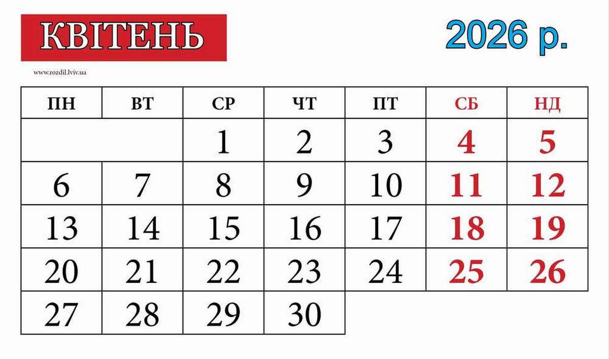 У квітні українці відпочиватимуть лише по суботах та неділях, адже додаткових вихідних під час воєнного стану не надають, навіть якщо святковий день збігається із суботою чи неділею. Вихідні квітня 2026 року – 4, 5, 11, 12, 18, 19, 25 і 26 числа. Про це повідомляє Інформатор.