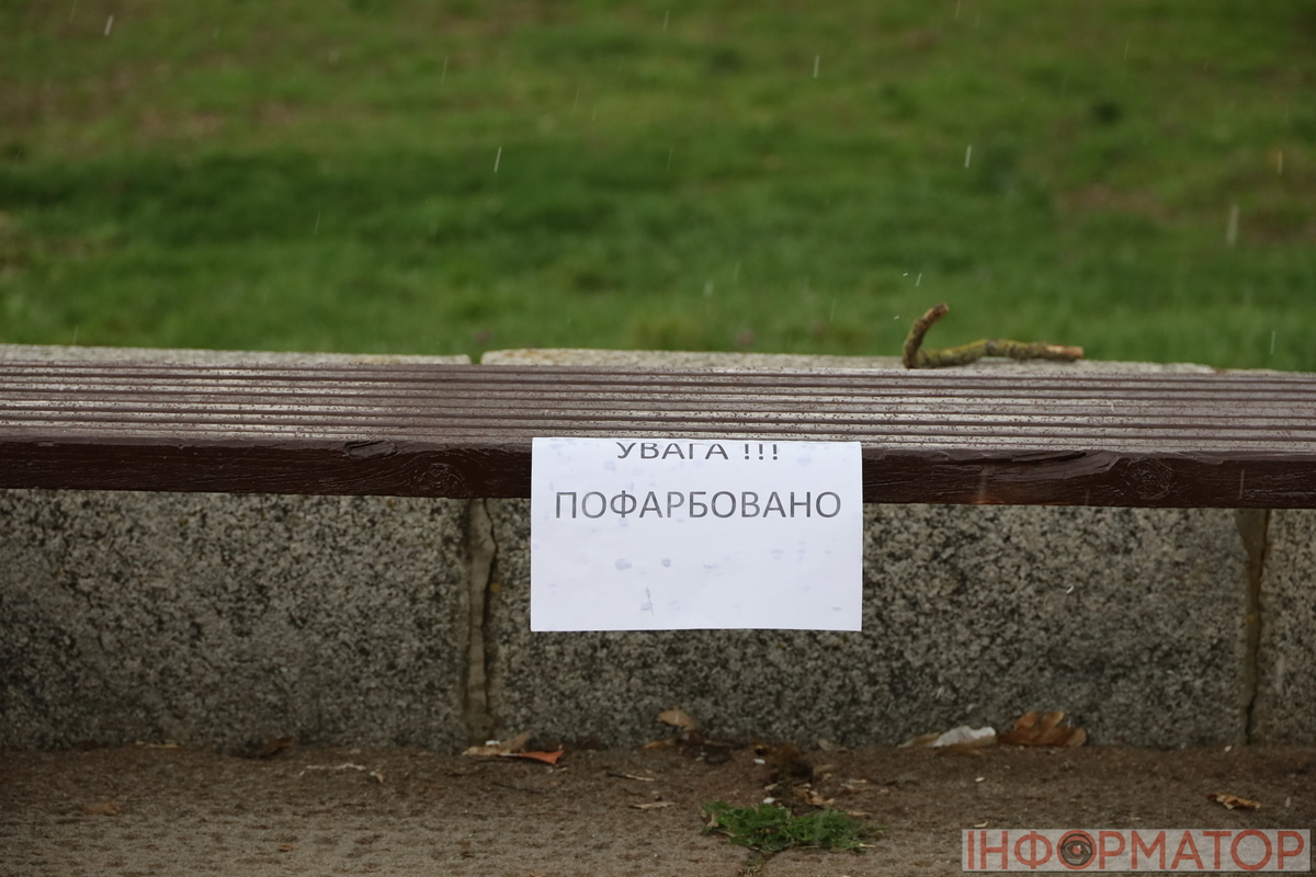Дощ змиває щойно пофарбовану лавку