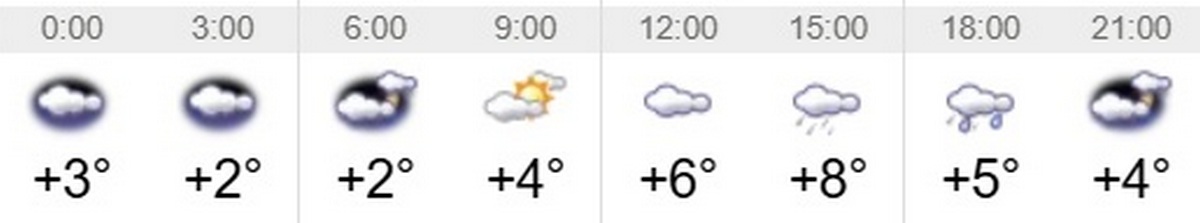 У суботу, 11 квітня, у Переяславі буде хмарно. По обіді очікується дощ, опади – 3,5 мм. Мінімальна температура повітря буде вночі та вранці – 2 градуси тепла. Максимальна вдень – 8 градусів вище нуля. Про це повідомляє Інформатор, посилаючись на sinoptіk.