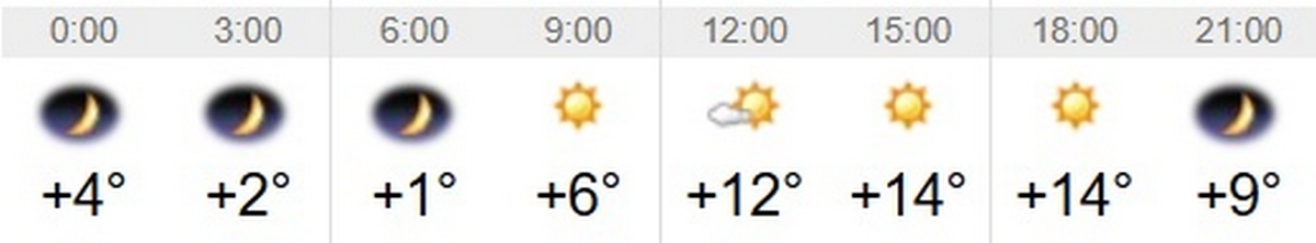 Швидкість вітру – 2-5 м/с. Вологість повітря коливатиметься між 37 та 90 відсотками протягом доби. Тривалість дня 14 квітня – 13 годин 43 хвилини. Завтра день буде на 4 хвилини довшим, ніж сьогоднішній. Світанок настане о 6:03, а захід – о 19:46.