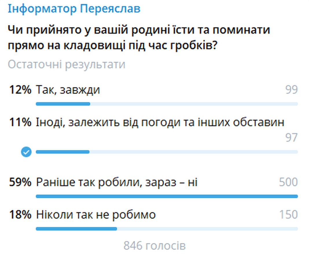 Тож Інформатор дізнавався, чи збереглася така традиція у жителів Переяслава. У рубриці “Питання тижня” через Telegram-канал ми поцікавилися, чи прийнято у родин переяславців їсти та поминати прямо на кладовищі під час гробків. Із 846 людей, які взяли участь в опитуванні, найбільше – 59% – відповіли, що раніше так робили, проте зараз не дотримуються цієї традиції. 18% опитаних взагалі ніколи так не роблять. 12% опитаних дозволяють собі їсти на кладовищах, а в 11% все залежить від погоди та інших обставин.