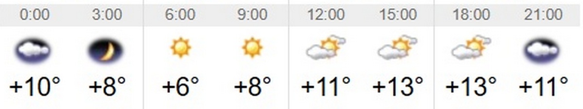 Швидкість вітру – 2-5 м/с. Вологість повітря коливатиметься між 49 та 95 відсотками протягом доби. Тривалість дня 18 квітня – 13 годин 57 хвилин. Завтра день буде на 4 хвилини довшим, ніж сьогоднішній. Світанок настане о 5:55, а захід – о 19:52.