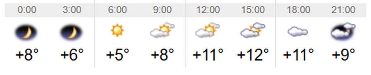 Швидкість вітру – 2-5 м/с. Вологість повітря коливатиметься між 42 та 93 відсотками протягом доби. Тривалість дня 19 квітня – 14 годин. Завтра день буде на 3 хвилини довшим, ніж сьогоднішній. Світанок настане о 5:53, а захід – о 19:53.