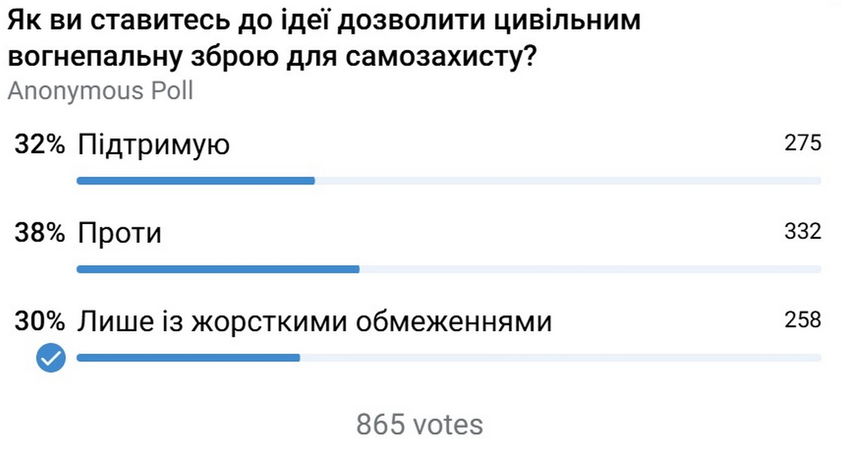 Враховуючи резонанс цієї теми, Інформатор у своєму Telegram-каналі поцікавився у жителів Переяслава, як вони ставляться до ідеї дозволити цивільним вогнепальну зброю для самозахисту. Із 865 людей, які взяли участь у голосуванні, найбільше – 38% – взагалі проти цього. Проте підтримують її повністю 32%, а із жорсткими обмеженнями – ще 30%.