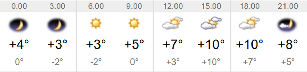 Швидкість вітру – 5-9 м/с. Вологість повітря коливатиметься між 35 та 53 відсотками протягом доби. Тривалість дня 27 квітня – 14 годин 28 хвилин. Завтра день буде на 4 хвилини довшим, ніж сьогоднішній. Світанок настане о 5:38, а захід – о 20:06.