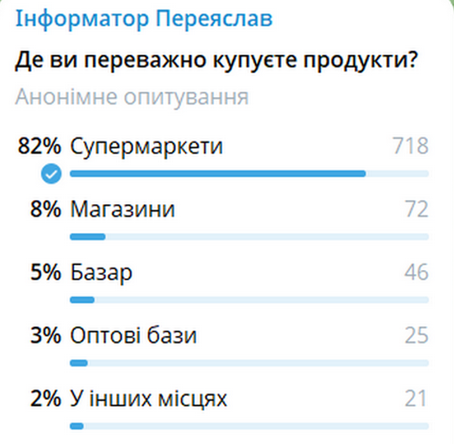 Отже, вибір місця для покупок продуктів залежать від стилю життя людини. Тож Інформатор у рубриці “Питання тижня” поцікавився, де переважно скуповуються жителі Переяслава. Із 882 людей, які взяли участь в опитуванні в Telegram-каналі видання, найбільше – 82% – відповіли, що для покупок обирають супермаркети. 8% ходять у звичайні магазини, 5% – віддають перевагу базару, а 3% – оптовим базам. Також 2% респондентів купують продукти у інших місцях.